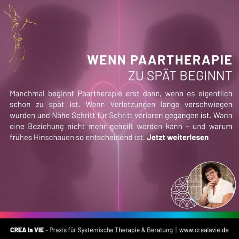 Paartherapie, Familie und Beziehungsfragen Wenn Paartherapie zu spät beginnt – und was das für die Beziehung bedeutet VonAnja Sobbe-Dippold Juni 9, 2025Februar 17, 2026